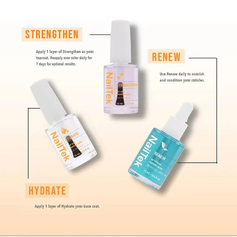 Recupera la fuerza y apariencia saludable de tus uñas con el Kit Restaurador NailTek Nail Recovery System, especialmente formulado para tratar uñas débiles, quebradizas o dañadas por el uso constante de esmaltes, acrílicos o factores externos. Este sistema integral fortalece, hidrata y mejora visiblemente la condición de las uñas desde la primera semana de uso.